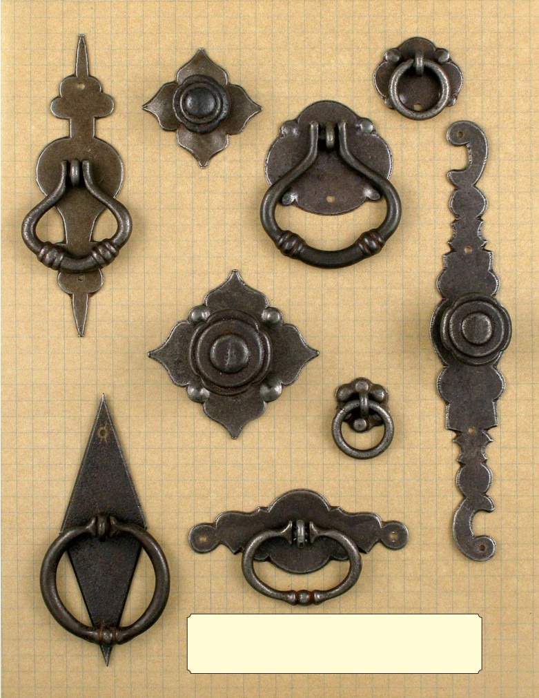 The image to the right shows a small selection of the many possibilities that can be realized by combining the rings, knobs and backplates available below. The patinated iron finish on these items is beautiful and will only improve with age and use. A wide range of backplates allows for a wide range of applications. Rings are supplied with a suitable nut and knobs are supplied with a machine screw.